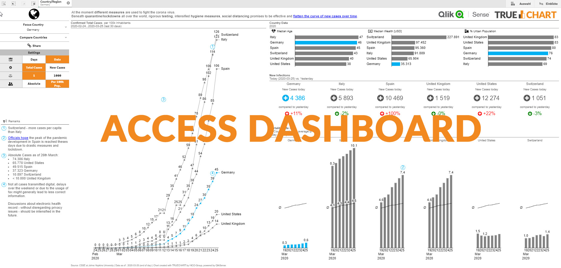 Coronavirus pandemic is a global threat. In order to give you an overview of the virus development in selected countries, we utillized our Business Intelligence software TRUECHART to build a dashboard for your use, entirely free of charge. This Dashboard offers a unique focus on key insights.